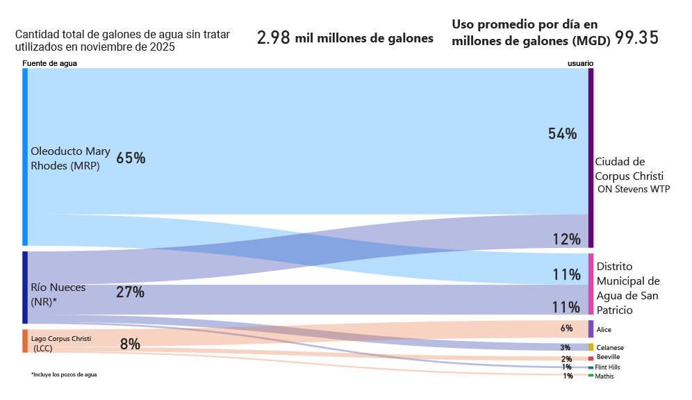 El embalse de Choke Canyon y el lago Corpus Christi son los suministros de agua más grandes y antiguos de la ciudad. La ciudad controla el agua de ambos embalses. Ambos se monitorean diariamente y funcionan según la Orden Acordada de la Comisión de Calidad Ambiental de Texas (TCEQ) de 2001. Esta Orden Acordada es un acuerdo entre el Estado y la ciudad que exige que el nivel combinado de almacenamiento del embalse se utilice para implementar las etapas de sequía. Por estas razones, la ciudad utiliza la capacidad combinada del embalse de Choke Canyon y el lago Corpus Christi como criterio de activación para el inicio de las etapas de sequía, como se describe en nuestro Plan de Contingencia para Sequías. Esto también garantiza la protección de nuestros principales suministros de agua.