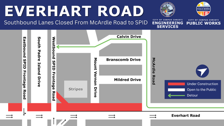 CORPUS CHRISTI, TX – The southbound lanes of Everhart Road from McArdle Road to SPID will be temporarily closed on Friday, January 23, from 2:00 a.m. to 6:00 a.m.