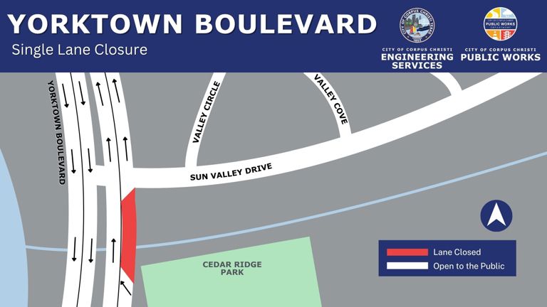 CORPUS CHRISTI, TX— Starting on October 27, Bridges Specialties will be conducting essential asphalt restoration work along Yorktown Boulevard at the intersection with Sun Valley Drive. This project aims to improve driving conditions and extend the lifespan of the road surface.